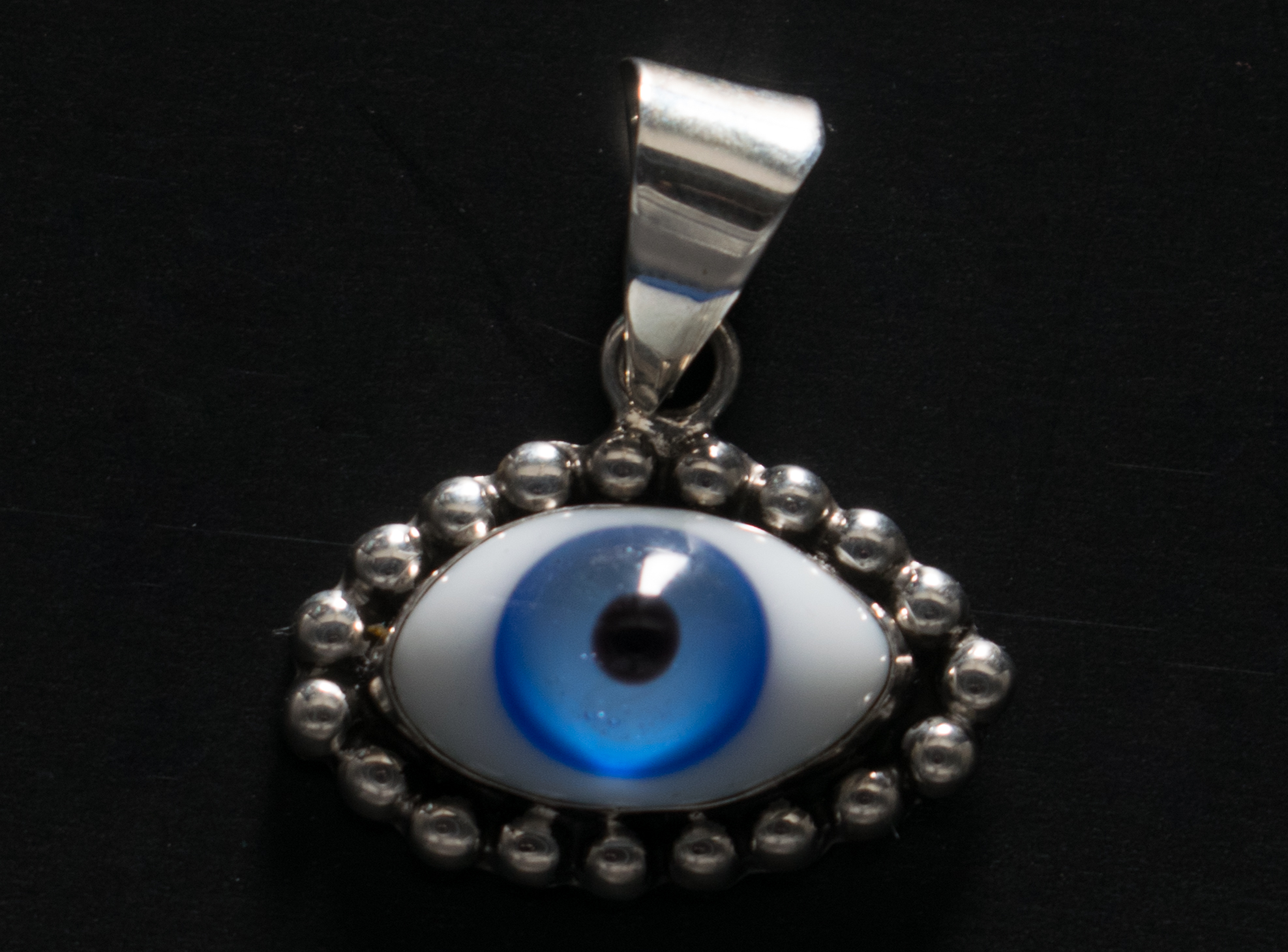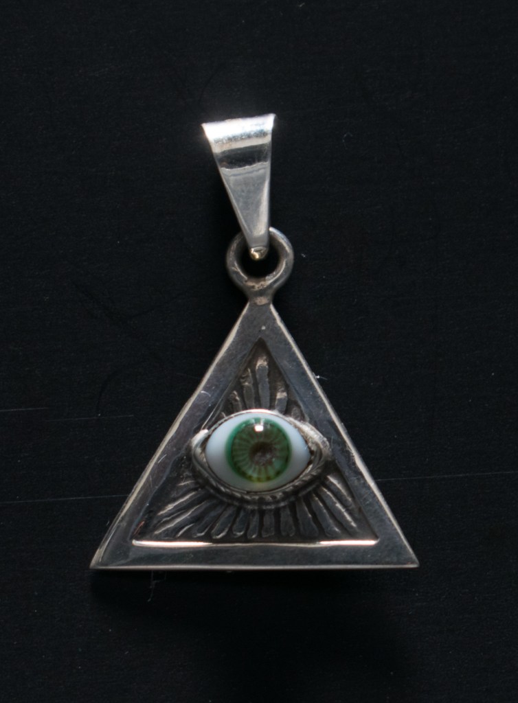 Dije ojo que todo lo ve liso en plata con ojo de cristal en color azul. Mide 21 por 30 mm $900