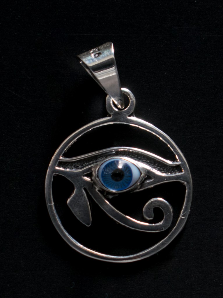 Dije de Horus en plata con ojo de cristal en color azul.