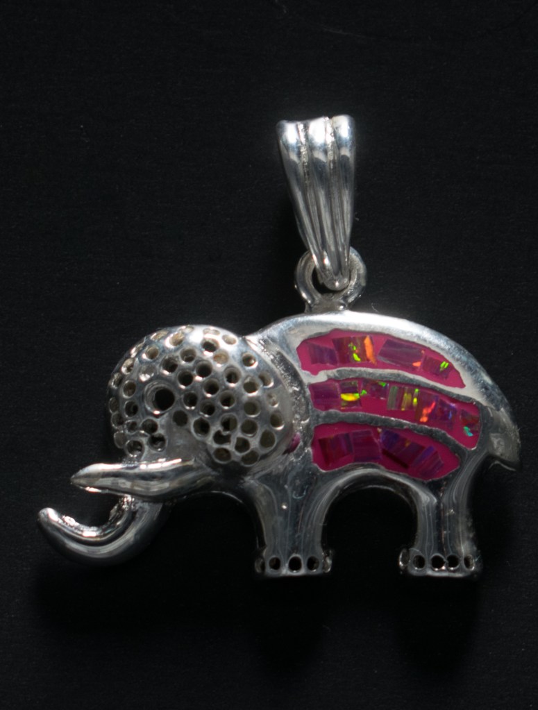 Dije de elefante en plata con ópalos en color rosa. Mide 35 por 35 mm $600