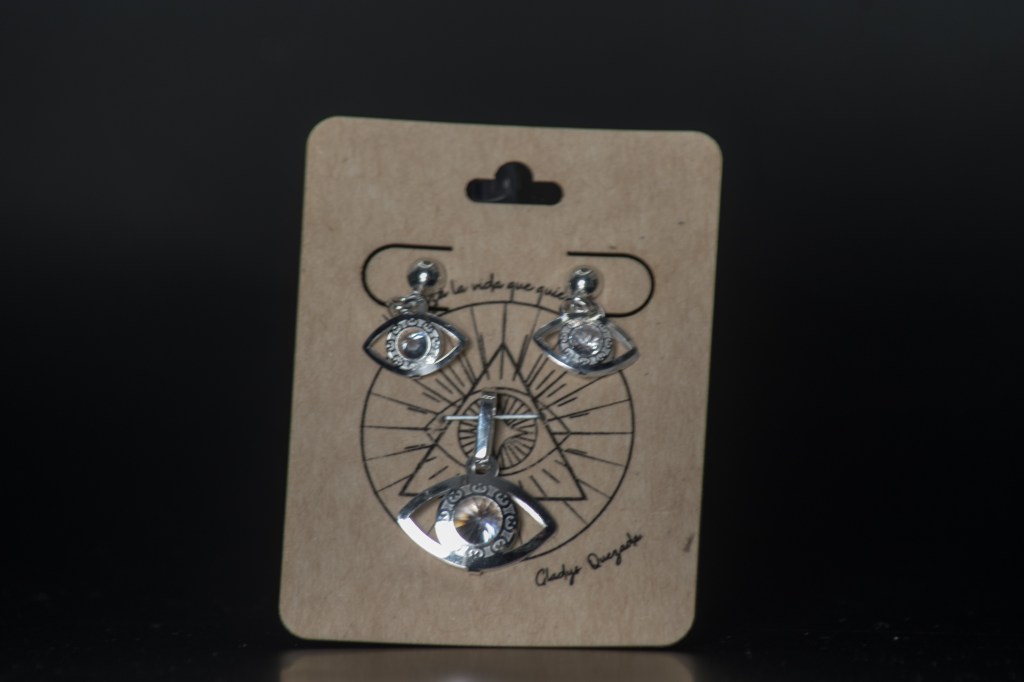 Set en plata dije y aretes colgantes en forma de ojos con Zirconias blancas.$1100