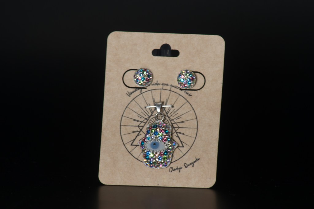 Set manita de Fátima en plata con zirconias de colores dije y aretes. $1100