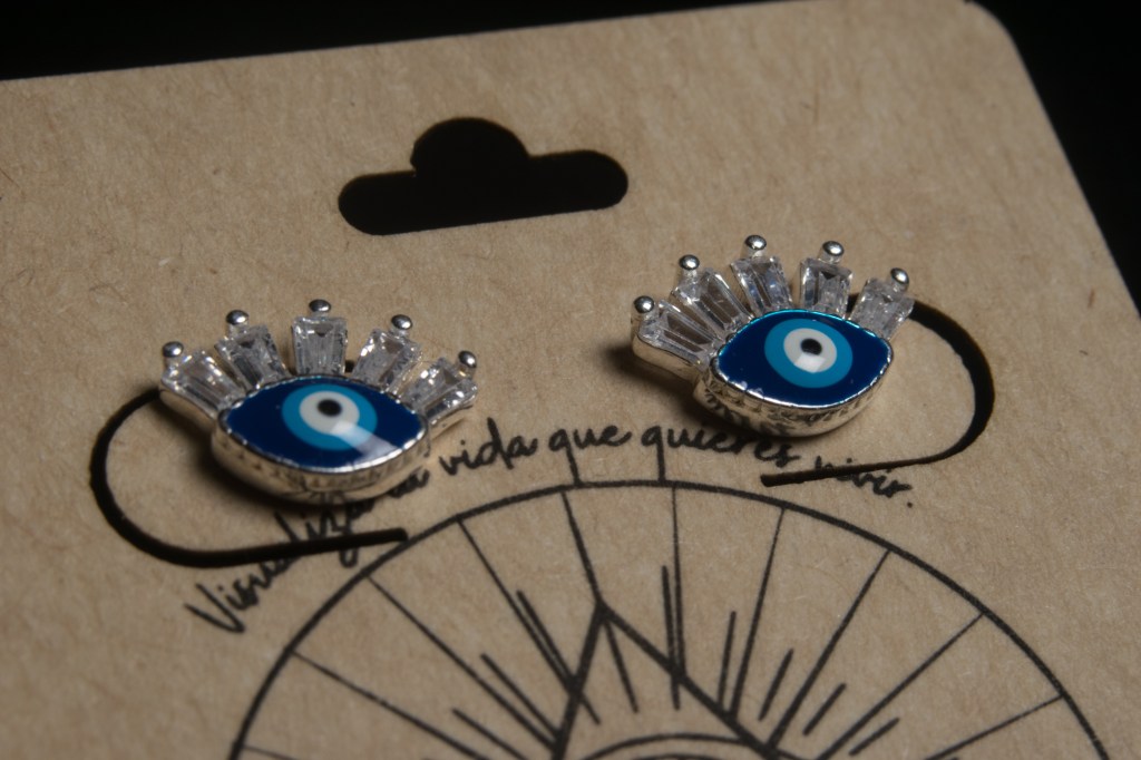 Aretes resplandor con ojo de cristal en color azul. $1800