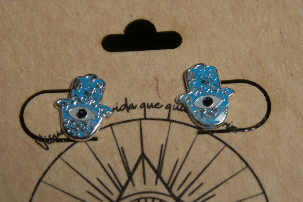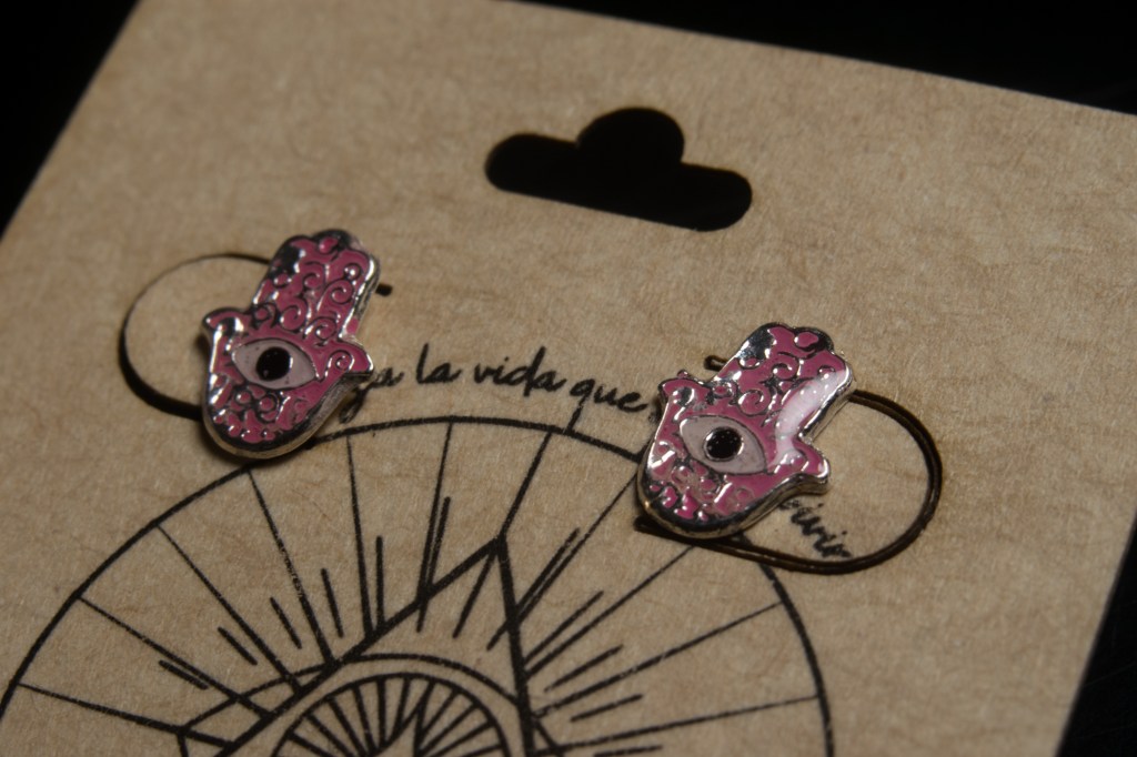 Aretes manita de Fátima en plata en color rosa y azúl. $200